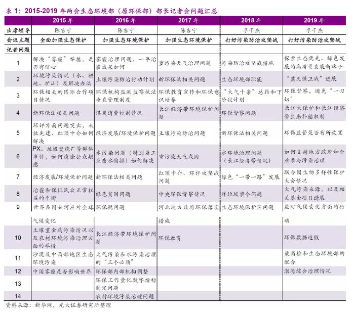 本文要點(diǎn)◆事件:3月5日,2019年政府工作報(bào)告發(fā)布(全文點(diǎn)擊:工作報(bào)告文字實(shí)錄|關(guān)于環(huán)保 克強(qiáng)總理這樣說);3月11日下午,生態(tài)環(huán)境部部長李干杰出席十三屆全國人大二次會(huì)議記者會(huì),就“打好污染防治攻堅(jiān)戰(zhàn)”相關(guān)問題回答中外記者提問?!粑廴痉乐瘟Χ炔粶p,體制機(jī)制改革持續(xù)推進(jìn)。在今年的“兩會(huì)”記者會(huì)上,李...