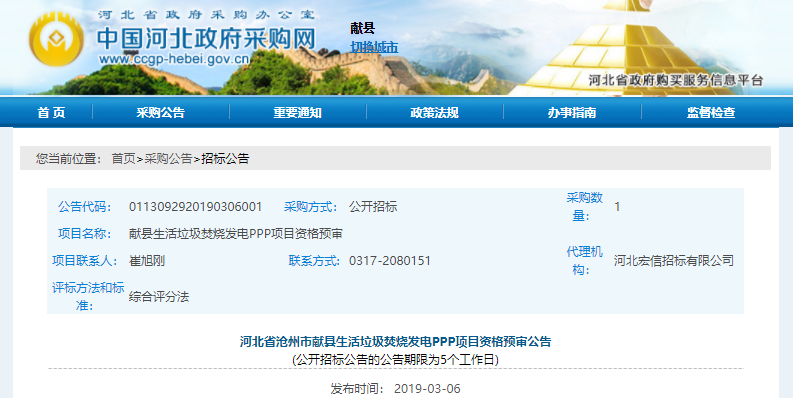 中國(guó)環(huán)聯(lián)網(wǎng)獲悉,3月6日,河北省滄州市獻(xiàn)縣生活垃圾焚燒發(fā)電PPP項(xiàng)目發(fā)布資格預(yù)審公告。本項(xiàng)目中主要建設(shè)內(nèi)容為:2×300t/d機(jī)械爐排爐+1×12MW凝汽式汽輪發(fā)電機(jī)組;配套建設(shè)垃圾接受與儲(chǔ)存系統(tǒng)、垃圾焚燒系統(tǒng)、余熱發(fā)電系統(tǒng)、煙氣凈化處理系統(tǒng)、灰渣處理系統(tǒng)、水處理系統(tǒng)等。本項(xiàng)目采用PPP運(yùn)作方式中的...