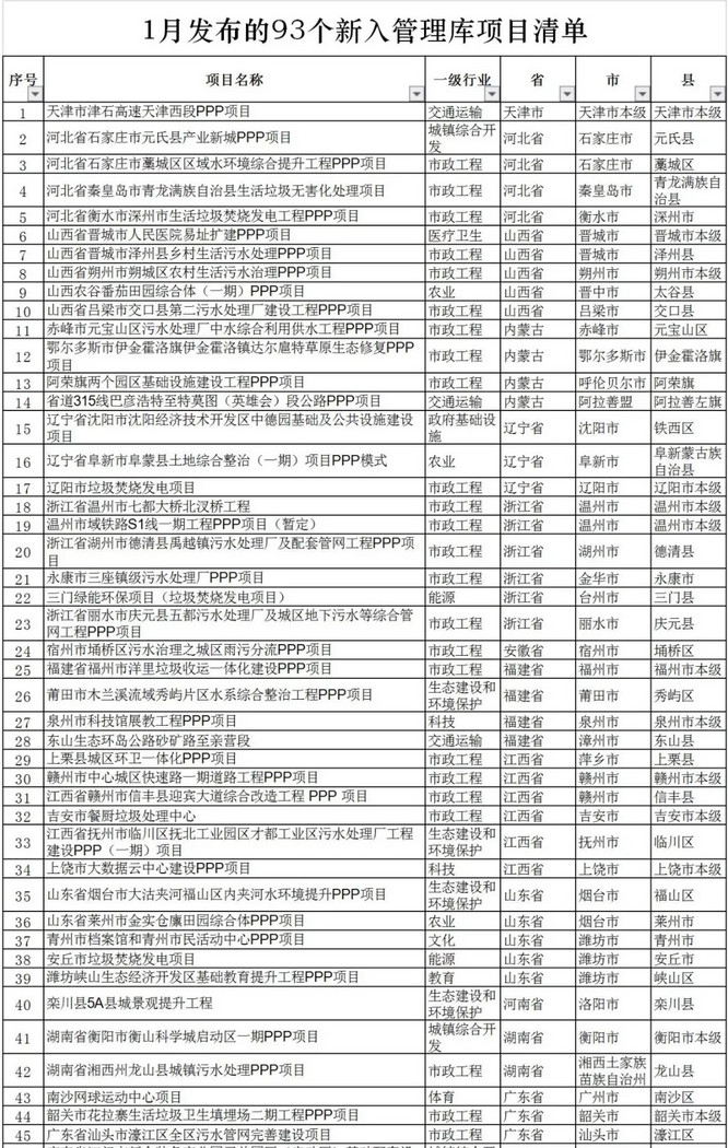 財政部PPP中心發(fā)布2019年1月納入全國PPP綜合信息平臺項目管理庫的項目清單。清單中涉及垃圾焚燒發(fā)電及污水處理等環(huán)保PPP項目。詳情如下: