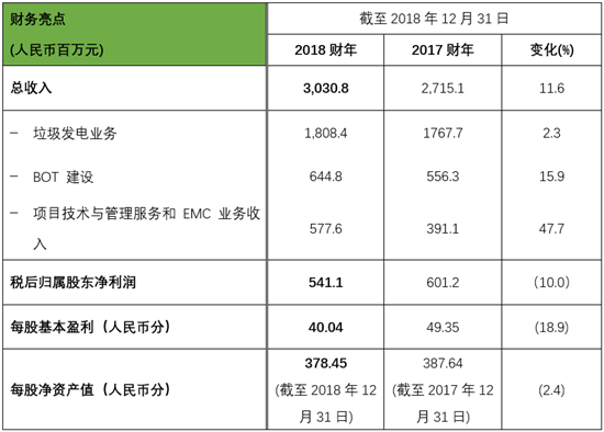 集團各業(yè)務版塊收入增加,2018財年集團總收入達到人民幣30.3億元。稅后歸屬股東凈利潤為人民幣5.4億元。在2018年12月31日和2017年12月31日,總發(fā)行股數為1,443,246,800和1,221,581,000。(新加坡,2019年3月3日) - 中國領先的垃圾焚燒發(fā)電(“WTE”)運...