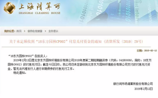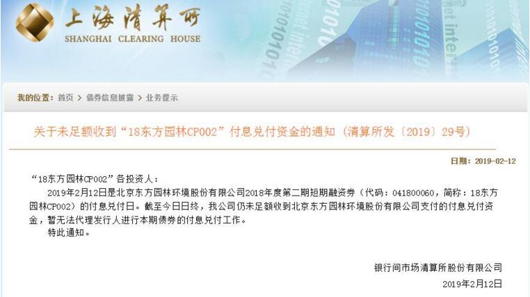 因為短融券未能如期兌付,再次讓市場神經(jīng)繃緊。2月12日下午,銀行間市場清算所股份有限公司(簡稱上海清算所)公告稱,2月12日是北京東方園林環(huán)境股份有限公司2018年度第二期短期融資券“18東方園林CP002”的付息兌付日。截至日終,仍未足額收到東方園林支付的付息兌付資金,暫無法代理發(fā)行人進(jìn)行本期債券...
