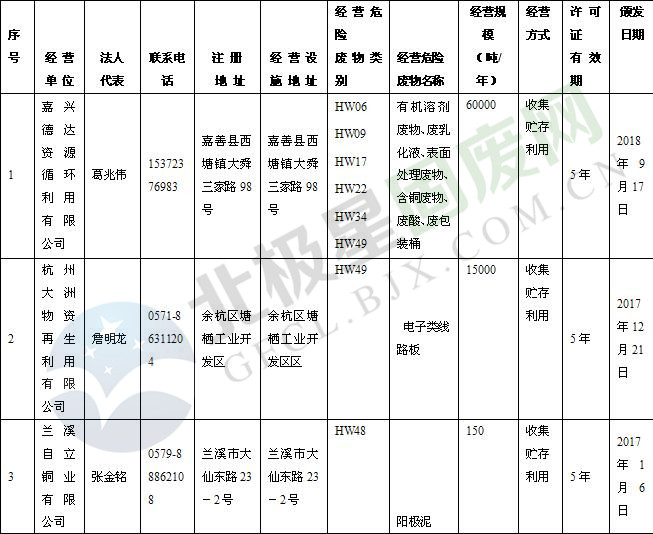 本文整理了浙江省截止至2019.1.22的危險廢物經(jīng)營單位,詳情如下: