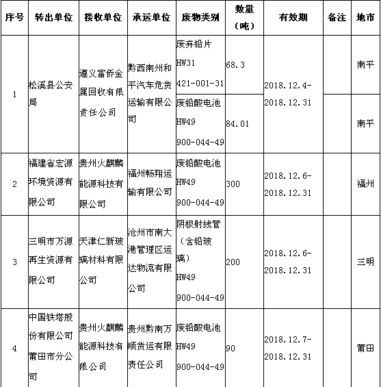 日前福建省環(huán)境保護(hù)廳發(fā)布了《2018年12月福建省危險(xiǎn)廢物跨省轉(zhuǎn)移情況公告》,共有24項(xiàng),具體內(nèi)容如下: