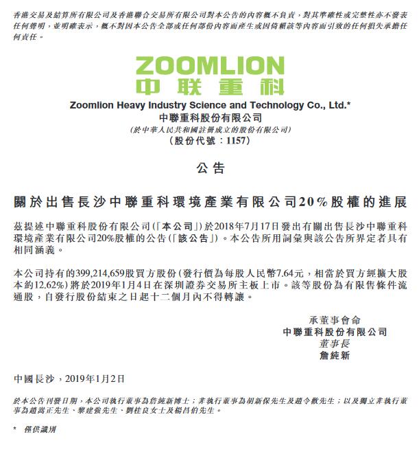 中聯(lián)重科發(fā)布公告,就此前有關(guān)出售長(zhǎng)沙中聯(lián)重科環(huán)境產(chǎn)業(yè)有限公司20%股權(quán),公司持有的3.99億股買(mǎi)方盈峰環(huán)境股份(發(fā)行價(jià)為每股人民幣7.64元,相當(dāng)于買(mǎi)方經(jīng)擴(kuò)大股本約12.62%)將于2019年1月4日在深圳證券交易所主板上市。該等股份為有限售條件流通股,自發(fā)行股份結(jié)束之日起12個(gè)月內(nèi)不得轉(zhuǎn)讓。原標(biāo)題...