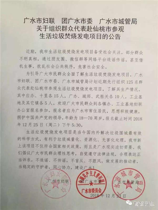 近期,我市生活垃圾焚燒發(fā)電項(xiàng)目備受社會(huì)關(guān)注,部分群眾不明真相,通過朋友圈、微信群等網(wǎng)絡(luò)平臺(tái)造謠傳謠,甚至借機(jī)生事,擾亂社會(huì)公共秩序,危害社會(huì)安全。為引導(dǎo)廣大市民群眾全面了解生活垃圾焚燒發(fā)電項(xiàng)目,廣水市婦聯(lián)、團(tuán)廣水市委、廣水市城管局計(jì)劃近期先行組織125名群眾代表赴仙桃市參觀生活垃圾焚燒發(fā)電項(xiàng)目,了解...