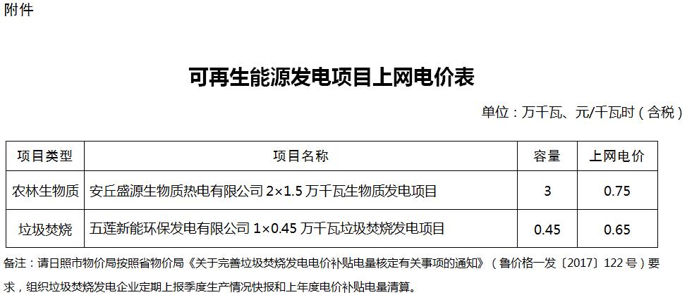 山東省發(fā)展和改革委員會關(guān)于安丘盛源生物質(zhì)熱電有限公司等可再生能源發(fā)電項目上網(wǎng)電價的批復(fù)魯發(fā)改價格〔2018〕1294號濰坊、日照市物價局:你們《關(guān)于核定安丘盛源生物質(zhì)熱電有限公司生物質(zhì)發(fā)電項目上網(wǎng)電價的請示》(濰價辦發(fā)〔2018〕44號)、《關(guān)于五蓮新能環(huán)保發(fā)電有限公司上網(wǎng)電價的請示》(日價格發(fā)〔2...
