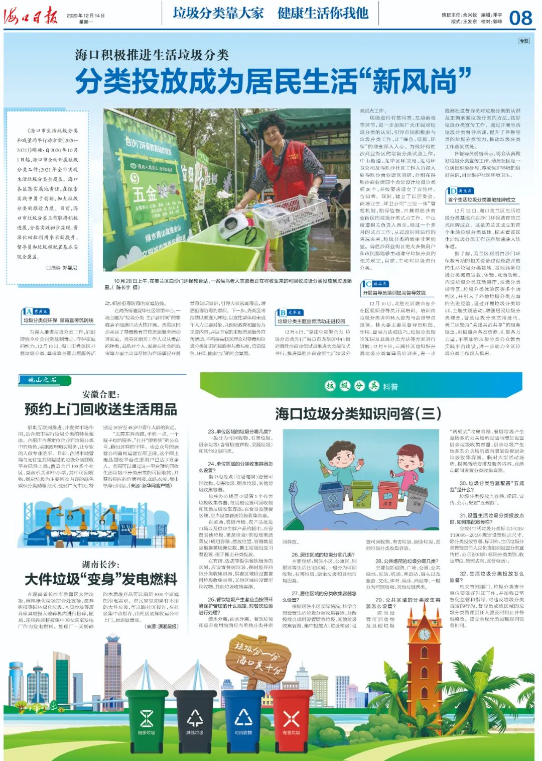 文章導(dǎo)讀《??谑猩罾诸惡蜏p量兩年行動方案(2020-2021)》明確:自2020年10月1日起,??谑腥骈_展垃圾分類工作;2021年全市實現(xiàn)生活垃圾分類全覆蓋。海口各區(qū)落實屬地責(zé)任,在探索實踐中勇于創(chuàng)新,加大垃圾分類的推進(jìn)力度。目前,海口市垃圾分類工作取得積極進(jìn)展,分類實效初步顯現(xiàn)、資源化回...