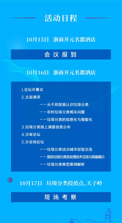 文章導(dǎo)讀中國城市環(huán)境衛(wèi)生協(xié)會垃圾分類專業(yè)委員會舉辦的“2020 垃圾分類杭州高峰論壇”,將于2020 年 10 月 15 日—17 日在杭州舉行。會議以“找差距、補短板,強化垃圾分類全過程管理”為主題,將薈萃全國環(huán)衛(wèi)領(lǐng)域精英,包括中國城市環(huán)境衛(wèi)生協(xié)會會長徐文龍、中國城市環(huán)境衛(wèi)生協(xié)會秘書長劉晶昊、中國...