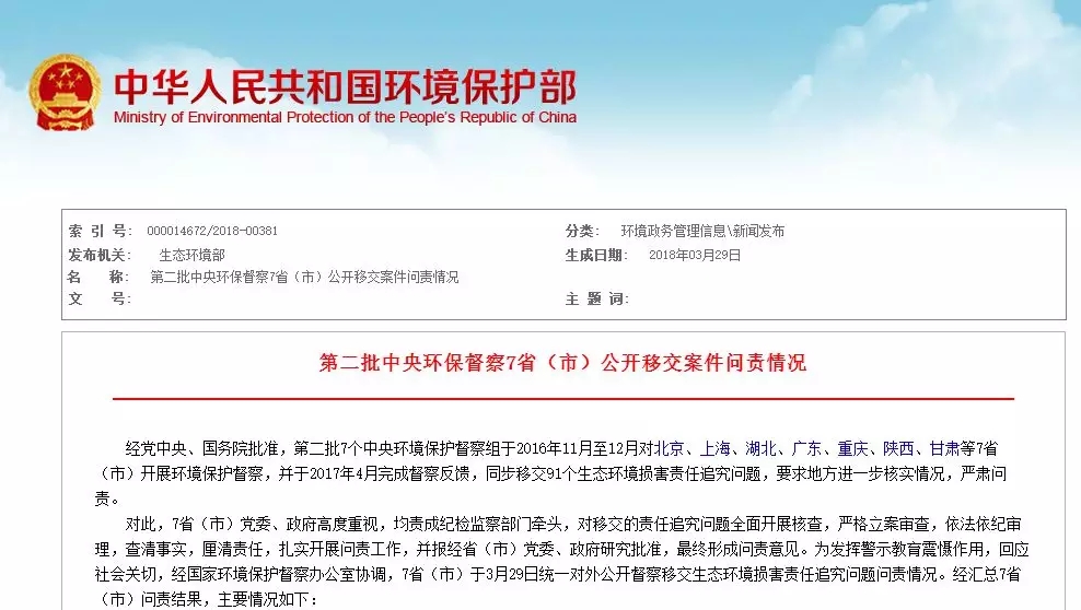 經(jīng)黨中央、國(guó)務(wù)院批準(zhǔn),第二批7個(gè)中央環(huán)境保護(hù)督察組于2016年11月至12月對(duì)北京、上海、湖北、廣東、重慶、陜西、甘肅等7?。ㄊ校╅_(kāi)展環(huán)境保護(hù)督察。3月29日,北京、上海、湖北、廣東、重慶、陜西、甘肅等7省(市)對(duì)外公開(kāi)了第二批中央環(huán)保督察移交生態(tài)環(huán)境損害責(zé)任追究問(wèn)題問(wèn)責(zé)情況。七省市共問(wèn)責(zé)1048人...