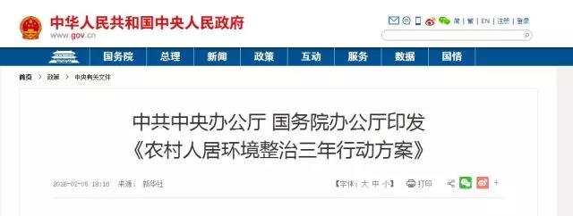 5號,中共中央辦公廳 國務院辦公廳印發(fā)《農村人居環(huán)境整治三年行動方案》。《方案》明確,以建設美麗宜居村莊為導向,以農村垃圾、污水治理和村容村貌提升為主攻方向,到2020年,實現(xiàn)農村人居環(huán)境明顯改善,村莊環(huán)境基本干凈整潔有序,村民環(huán)境與健康意識普遍增強。來源:中國經濟網、中國政府網國家發(fā)改委解讀:讓農...