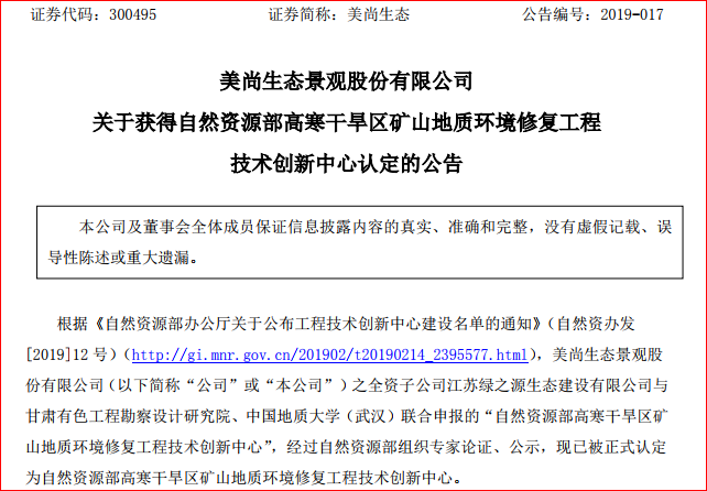 2019年2月18日,美尚生態(tài)景觀股份有限公司(簡稱“美尚生態(tài)”)發(fā)布公告,公司全資子公司江蘇綠之源生態(tài)建設(shè)有限公司與甘肅有色工程勘察設(shè)計研究院、中國地質(zhì)大學(xué)(武漢)聯(lián)合申報的“自然資源部高寒干旱區(qū)礦山地質(zhì)環(huán)境修復(fù)工程技術(shù)創(chuàng)新中心”,經(jīng)過自然資源部組織...