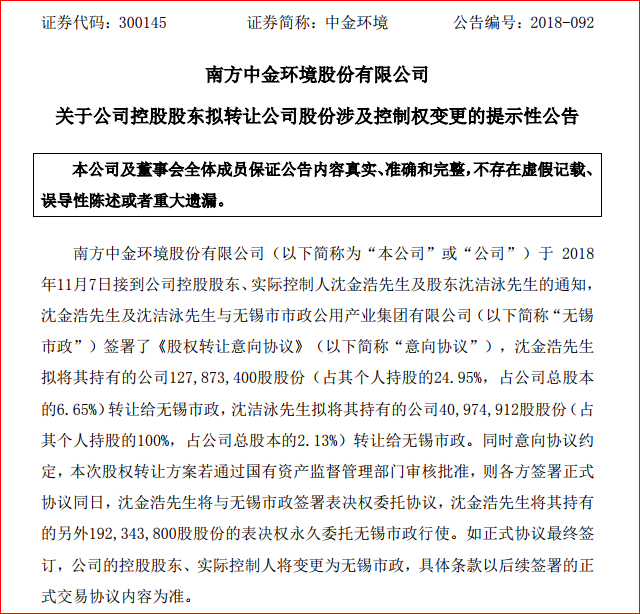 中金環(huán)境公告,公司控股股東、實(shí)際控制人沈金浩及股東沈潔泳與無錫市市政公用產(chǎn)業(yè)集團(tuán)有限公司(以下簡(jiǎn)稱“無錫市政”)簽署《股權(quán)轉(zhuǎn)讓意向協(xié)議》。 沈金浩擬將其持有的公司127,873,400股股份(占其個(gè)人持股的24.95%,占公司總股本的6.65%)轉(zhuǎn)讓給無錫市政,沈潔泳擬將其持...