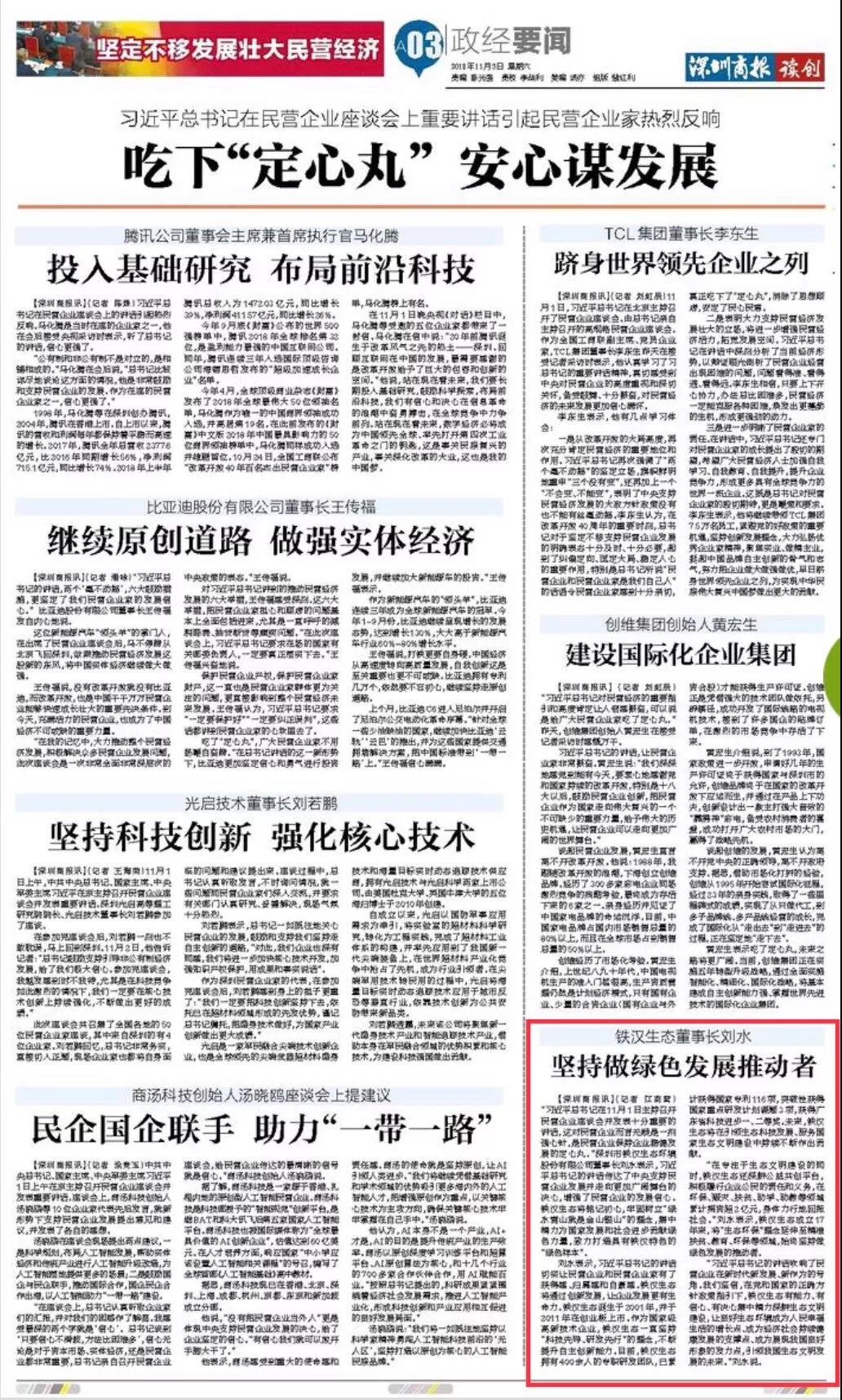 近日,習(xí)近平總書記在民營企業(yè)座談會(huì)上的重要講話引起民營企業(yè)家熱烈反響,鐵漢生態(tài)作為生態(tài)環(huán)保龍頭民營企業(yè),劉水董事長積極回應(yīng)。在11月3日《深圳商報(bào)》刊登的“堅(jiān)定不移發(fā)展壯大民營經(jīng)濟(jì)”專題報(bào)道中,劉水表示,習(xí)近平總書記的講話切實(shí)讓民營企業(yè)和民營企業(yè)家有了獲得感、歸屬感和自豪感。鐵漢生態(tài)將銘記初心,牢固...