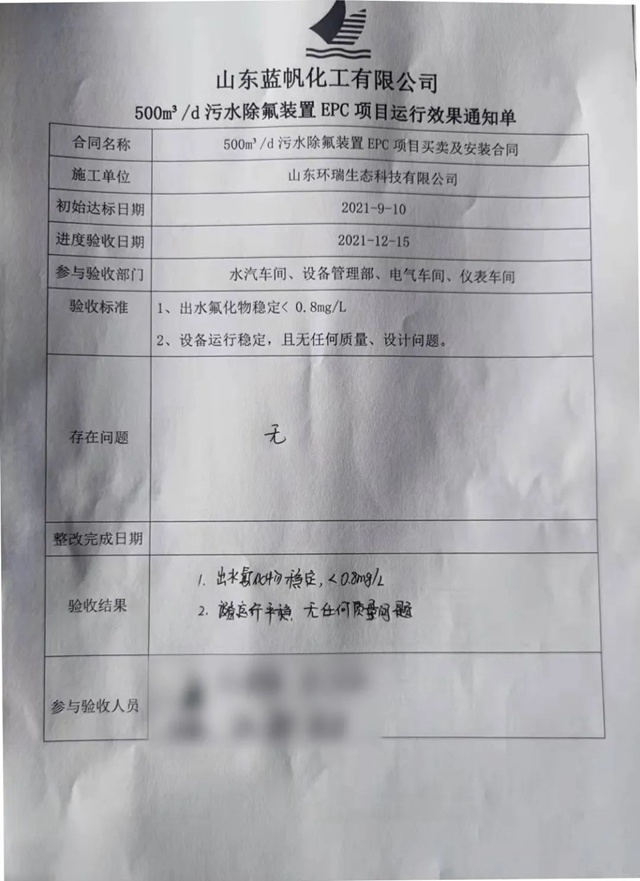 2021年12月15日,環(huán)瑞生態(tài)深度除氟<0.8mg/L項(xiàng)目——《藍(lán)帆化工煤造氣廢水深度除氟項(xiàng)目》順利通過竣工驗(yàn)收! 項(xiàng)目運(yùn)行效果通知單 經(jīng)過三個(gè)月的艱苦奮戰(zhàn),順利完工驗(yàn)收,系統(tǒng)連續(xù)運(yùn)行三個(gè)月出水完全達(dá)標(biāo),出水氟離子濃度穩(wěn)定<0.8mg/L,且無裝置設(shè)備運(yùn)行質(zhì)量問...
