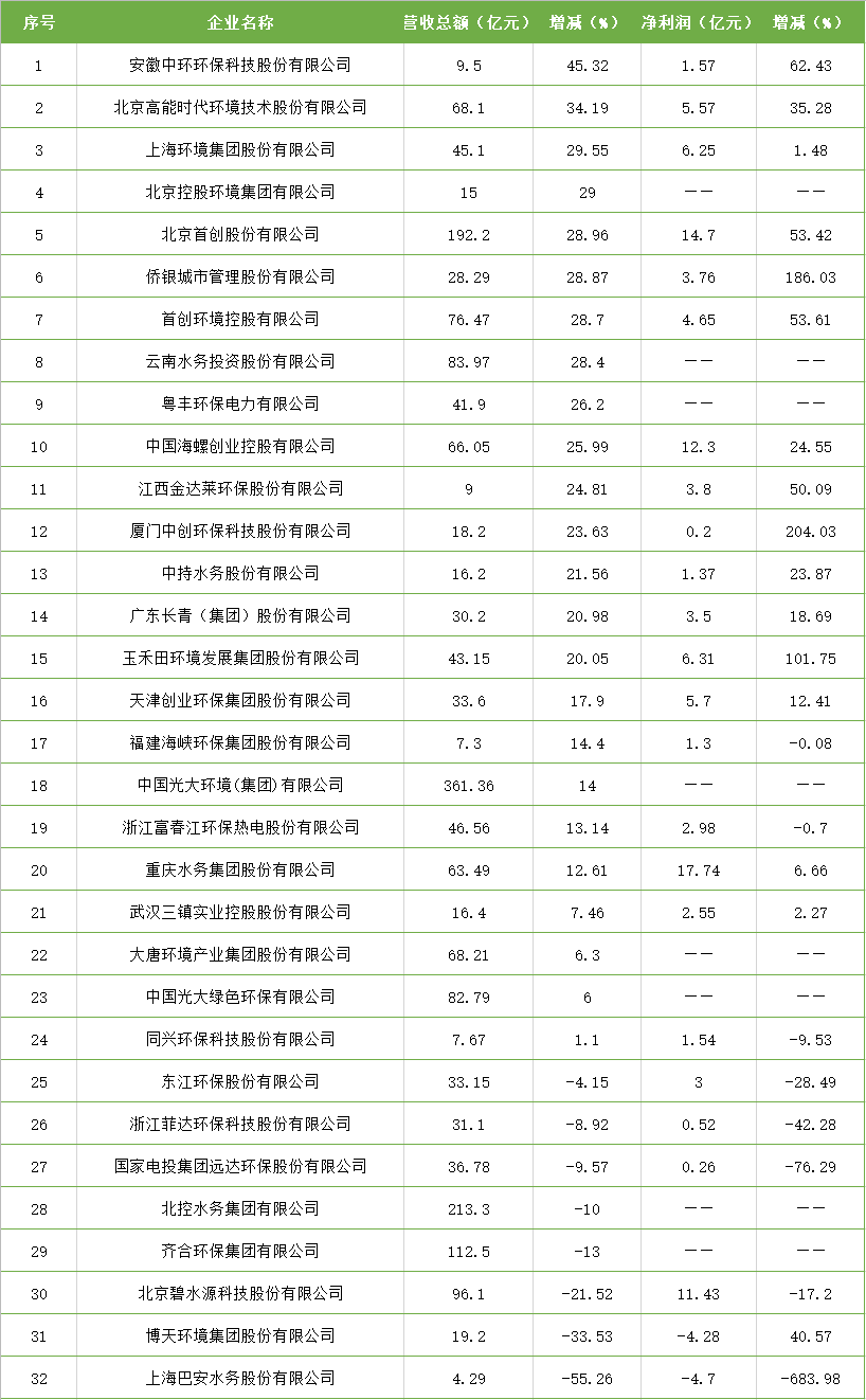 環(huán)保上市企業(yè)2020年業(yè)績報告基本公開地差不多了,甚至很多企業(yè)率先發(fā)布了2021年一季度業(yè)績預告。 環(huán)保在線曾發(fā)布了【13家環(huán)保上市企業(yè)年報匯總】,現(xiàn)更新19家,來看一下各自的盈虧情況。 1、大唐環(huán)境產(chǎn)業(yè)集團股份有限公司 2020年度,大唐環(huán)境營收約68.21億元,同比增加6.3%;毛利報11.68...