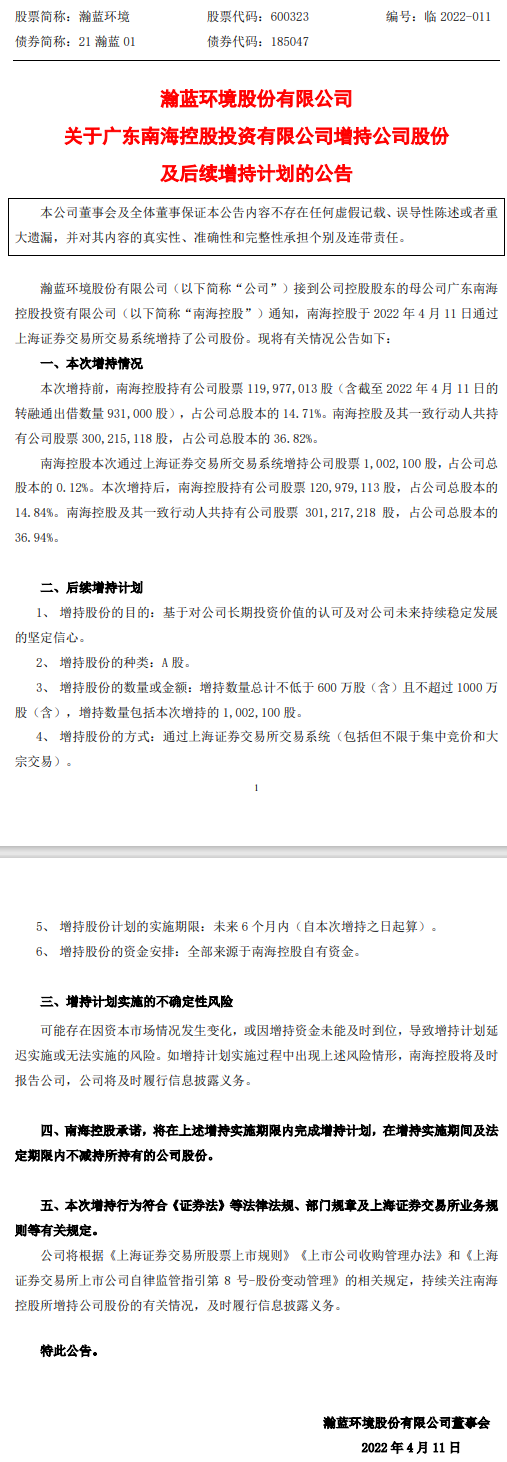 2022年4月11日,瀚藍環(huán)境股份有限公司(下稱“瀚藍環(huán)境”)發(fā)布公告稱,廣東南海控股投資有限公司(下稱“南??毓?rdquo;)已成功通過上海證券交易所交易系統(tǒng)增持了股份。 據(jù)了解,本次增持前,南海控股持有瀚藍環(huán)境14.71%的股份,及其一致行動人共持有瀚藍環(huán)境...
