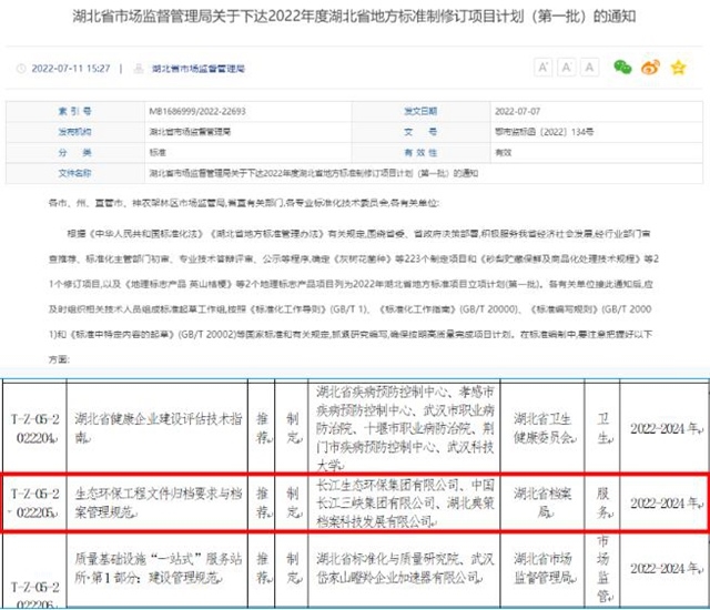近日,湖北省市場監(jiān)督管理局印發(fā)關(guān)于下達(dá)2022年度湖北省地方標(biāo)準(zhǔn)制修訂項(xiàng)目計(jì)劃(第一批)的通知,長江環(huán)保集團(tuán)牽頭主編的《生態(tài)環(huán)保工程文件歸檔要求與檔案管理規(guī)范》成功入選2022年湖北省地方標(biāo)準(zhǔn)項(xiàng)目立項(xiàng)計(jì)劃(第一批),這是公司成立以來首次牽頭主編的省級地方標(biāo)準(zhǔn)?!逗笔∈袌霰O(jiān)督管理局關(guān)于下達(dá)2022年...